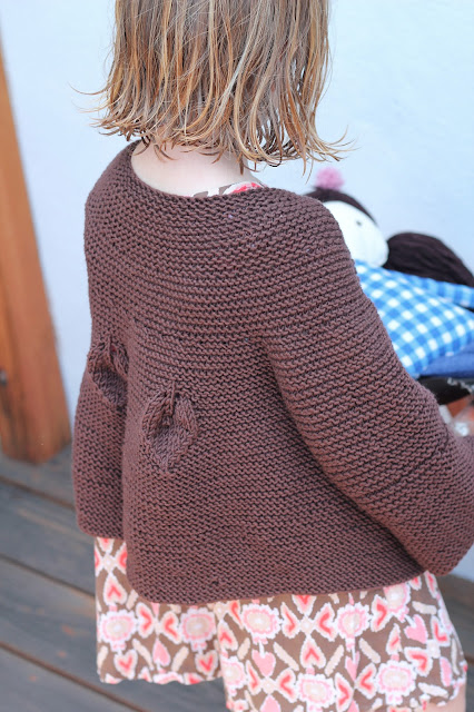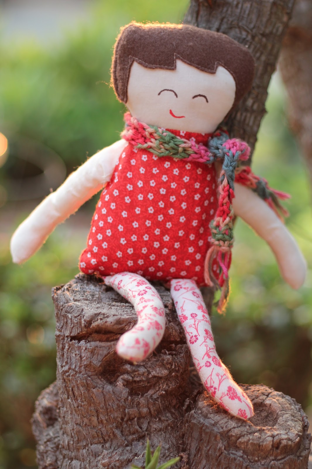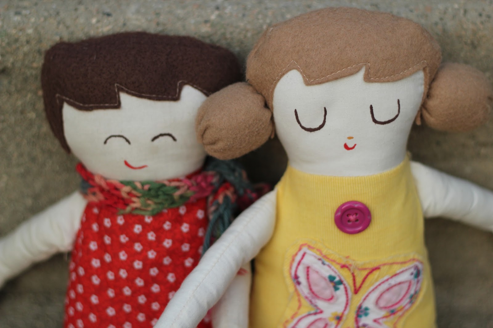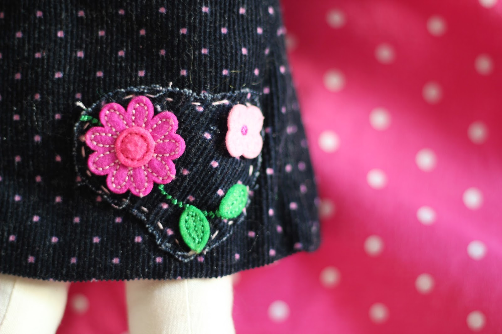 But I still love her. I even dressed her in another of Bun's old baby dresses - a little corduroy jumper - and stitched on some of the flowered details with a messy straight stitch. (Yes, I did save a lot of baby clothes.)