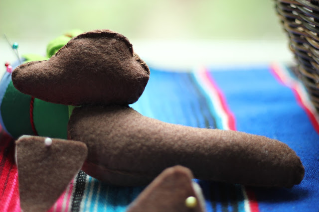 For the shoes, I went with yellowish felt for contrast with the dress. I also didn't have any matching thread so I went with a darker thread for contrast. It would seem that yellowish felt + darker thread = moccasins! I went with it and tied a few French knots to stand in for little beads.